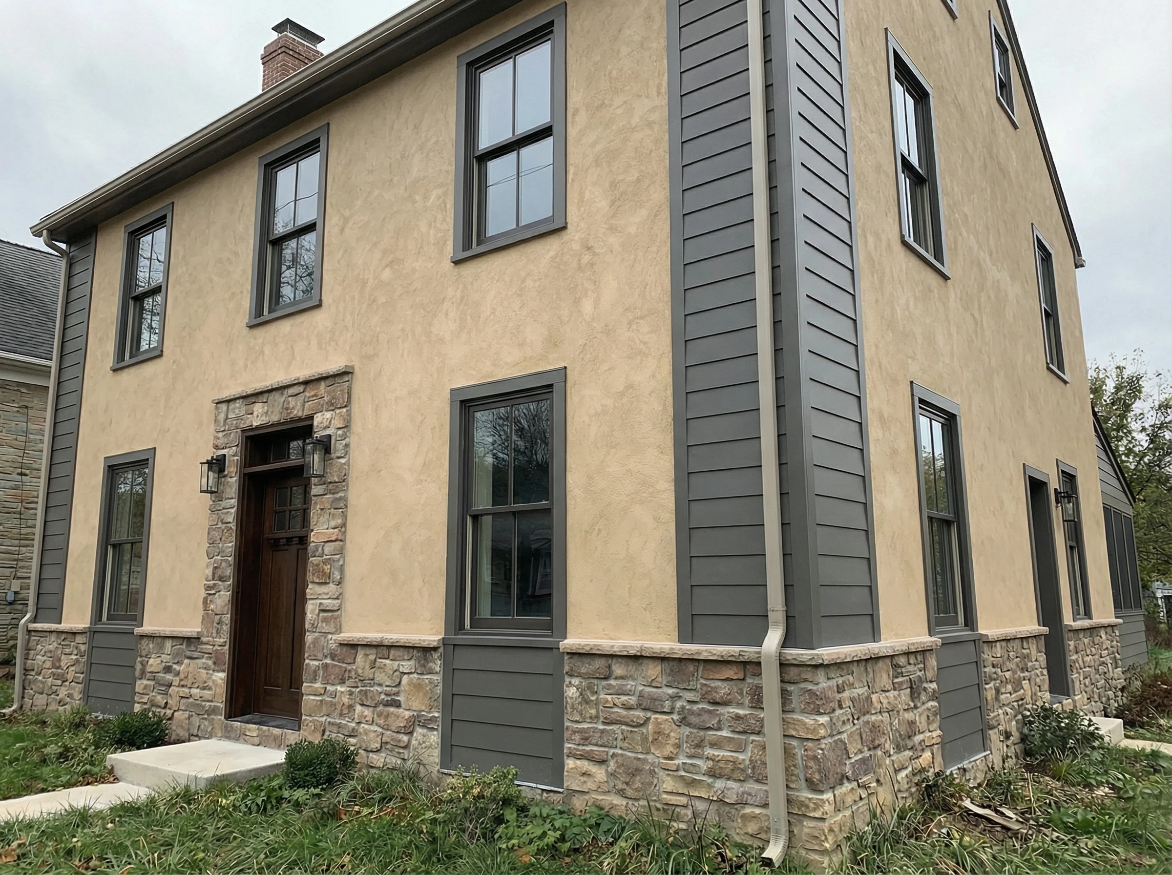 Срок службы: 50-100+ летНатуральный камень (гранит, песчаник, известняк, сланец) — самый дорогой и долговечный вариант. Искусственный камень визуально неотличим, но в 2-3 раза дешевле и легче. Часто камнем облицовывают не весь фасад, а только цоколь и отдельные зоны.