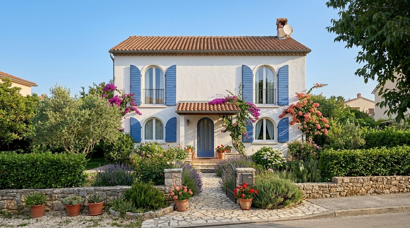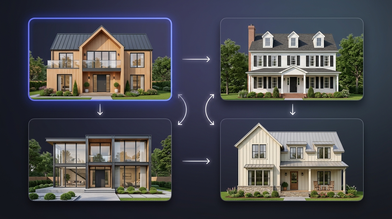 ИИ для дизайна сохраняет геометрию здания — все оконные и дверные проёмы, пропорции и ракурс остаются на месте. Меняется только внешняя отделка: материалы, цвет, стиль. 15+ архитектурных стилей: современный, скандинавский, хай-тек, классический, лофт, прованс, средиземноморский и другие варианты отделки фасада.